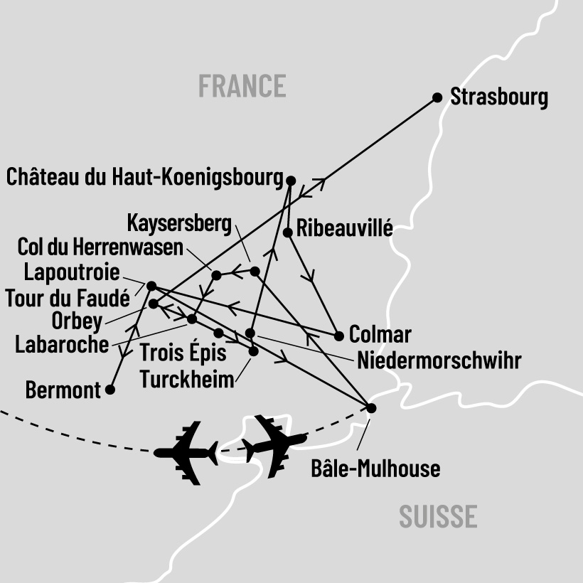 Bienvenue en France, randonnez au cœur des plus beaux paysages de l’Alsace. Au programme, une randonnée pédestre sur de magnifiques sentiers à travers des paysages typiques : maisons à colombages, vignobles, forêts, vallons et le tout à la belle saison. Voyez Strasbourg et sa cathédrale ; Colmar, ville la mieux préservée de cette région ; Riquewihr qui produit l’un des meilleurs crus d’Alsace ; Ribeauvillé et ses rues d'architecture médiévale et le Haut-Koenigsbourg avec son château. Lors de votre voyage, vous visiterez une cave à vin, vous ferez un tour en bateau-mouche à Strasbourg et vous profiterez d'un souper gastronomique. Un programme riche en découvertes et en émotions.